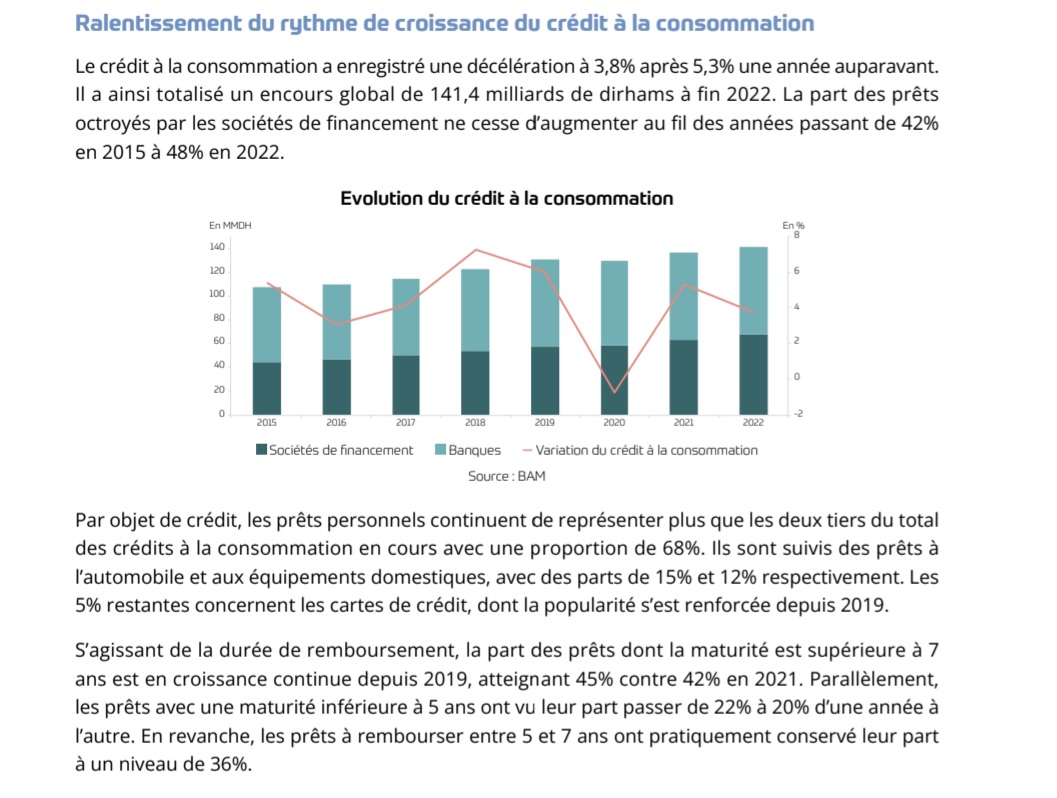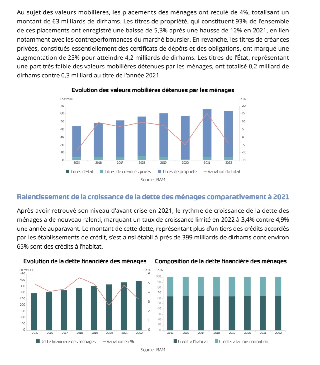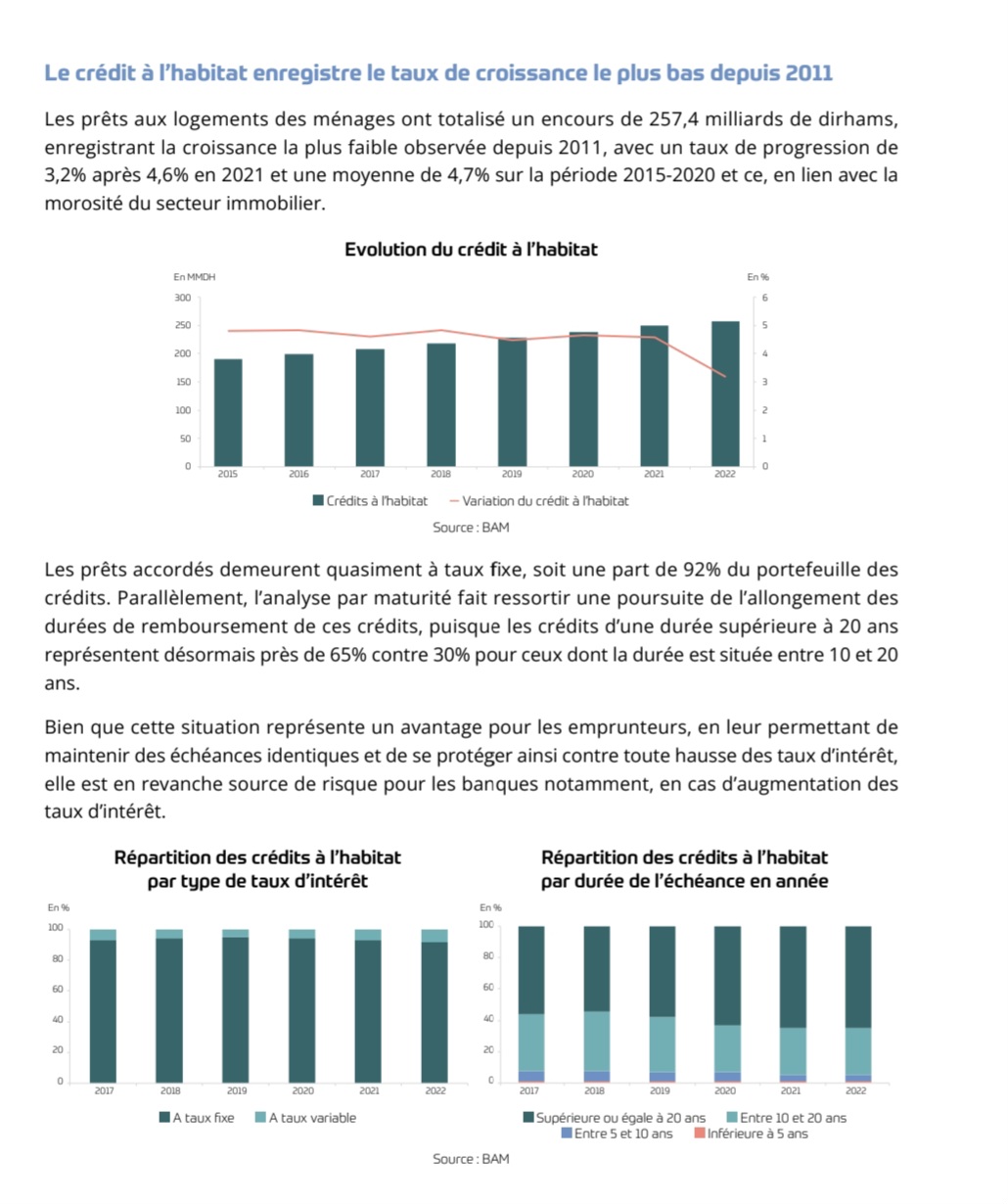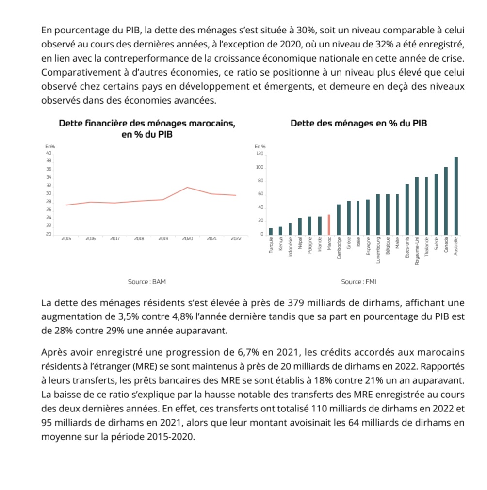 L’analyse des données granulaires recueillies auprès des principaux établissements de crédit, portant sur les nouveaux crédits accordés aux particuliers au titre de l’année 2022, fait ressortir un niveau d’endettement moyen de 35% de leurs revenus contre une moyenne de 31% sur la période 2015-2021, reflètant la hausse de la charge d’endettement des ménages.