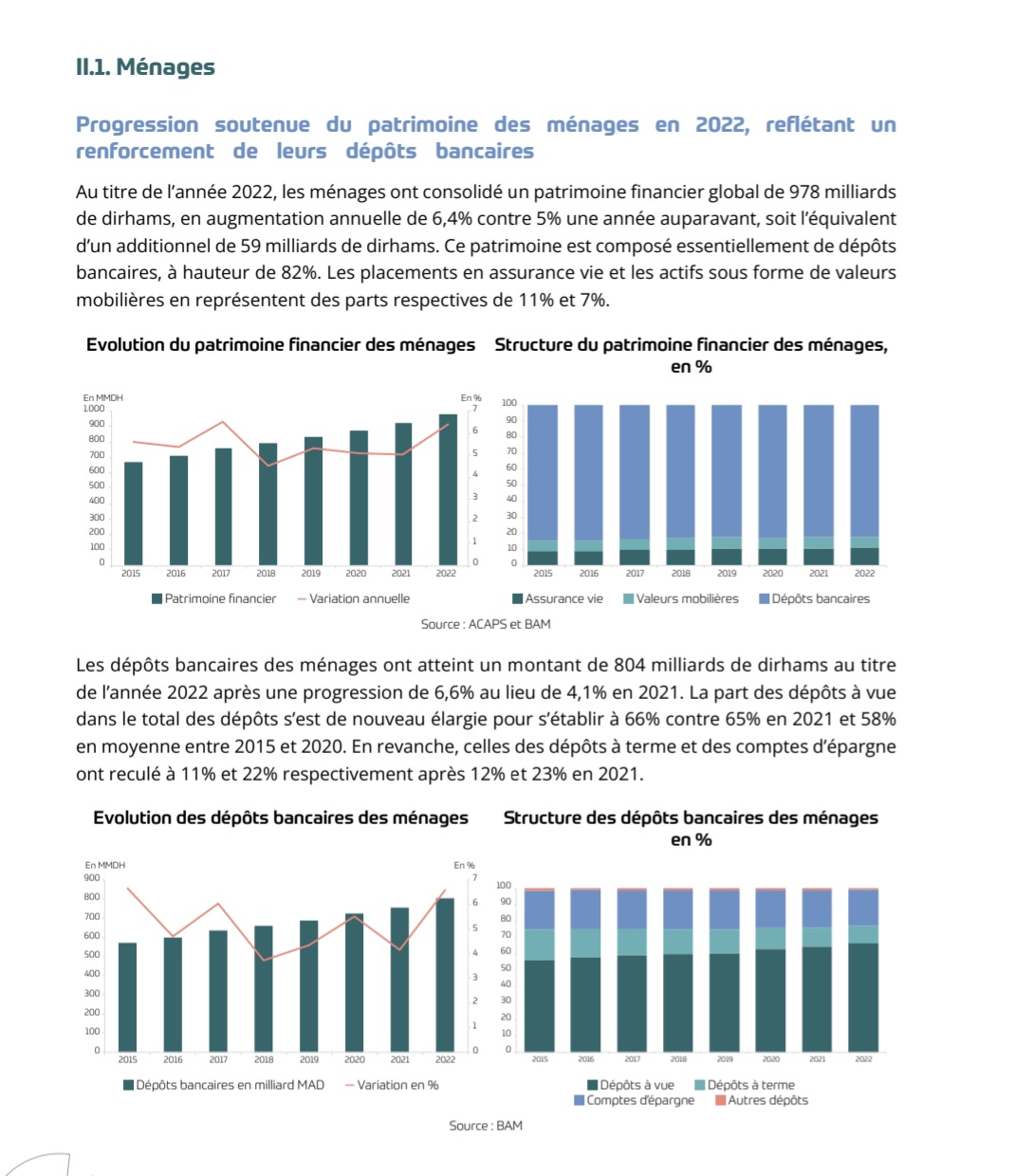 Les actifs financiers détenus par les ménages marocains se sont renforcés en 2022, en enregistrant une croissance de 6,4% après 5% une année auparavant. Ils ont ainsi, totalisé un montant de 978 milliards de dirhams, dont 804 milliards sous forme de dépôts bancaires, soit une part de 82%. Les placements des ménages en termes d’assurance vie et de valeurs mobilières ont maintenu un rythme de progression globalement soutenu, représentant respectivement 11% et 7% de leur patrimoine financier. C’est ce qui ressort de la 10ème édition du Rapport sur la Stabilité Financière au titre de l’exercice 2022, publié par Bank Al-Maghrib