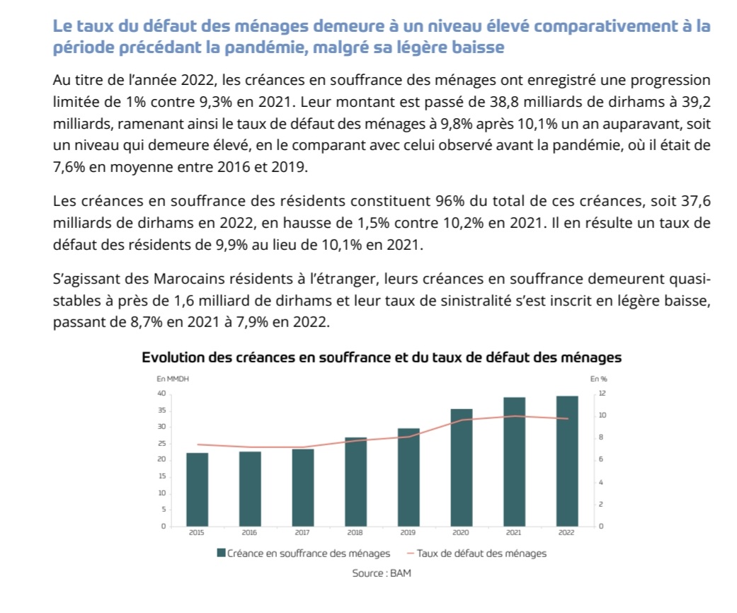 Parallèlement, la croissance de la dette financière des ménages a enregistré une décélération, qui a concerné aussi bien les prêts alloués à l’achat de logement que ceux destinés à la consommation. Rapportée au PIB, cette dette s’est maintenue aux alentours de 30%. Le taux de défaut de paiement des ménages demeure élevé, s’établissant à 9,8% après 10,1% en 2021.