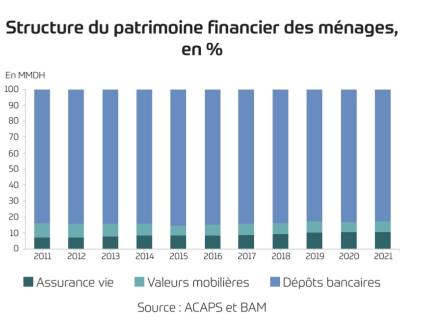 Le patrimoine financier des ménages ( hors monnaie fiduciaire) a progressé de 5%, en rythme annuel, en 2021contre 5,1% en 2020 et 5,5% en moyenne sur la période 2015-2019. Son montant global s’élève à 919,5 milliards de dirhams composé à hauteur de 82% de dépôts bancaires contre 11% pour les placements en assurance vie et 7% sous forme de valeurs mobilières. Cette structure reste quasiment inchangée d’une année à l’autre, selon Bank Al-Maghrib.