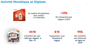 Le groupe se veut une banque hydrique et renforce aussi bien son réseau physique que sa présence digitale. Ainsi, l’année dernière, le groupe a mise en exploitation de la nouvelle Direction Régionale de Saiss et de 7 nouvelles agences. Il a également implanté 60 nouveaux GAB dans le cadre de partenariat. Côté monétique et digital, les transactions ont augmenté de 35% par rapport à 2019. La banque en lugne a enregistré 441.000 connexions par jour en 2020, soit une hausse de 66%. De plus, 95% des virements ont été effectués en ligne en 2020. Concernant les indicateurs de rentabilité, le PNB consolidé s’est accru de 10,3 % à 2,76 milliards de DH. Cependant, le Résultat Net Part du Groupe s’établit à 80,7 millions de DH en baisse de 81,1% l’effet de l’imputation du don au fonds COVID-19 et de l’impact du coût du risque.