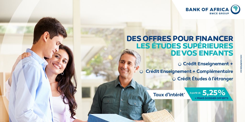 – Le crédit Enseignement+ : BANK OF AFRICA octroie un prêt à hauteur de 250.000 DH, à raison de 50 000 DH/année d’étude, destiné à financer les frais de scolarité dans les instituts de l’enseignement supérieur privé, reconnus par l’état. Proposé à un taux promotionnel avec exonération sur les frais de dossier, il offre aux tuteurs la possibilité de bénéficier d’un différé allant jusqu’à 6 ans sur une durée de remboursement s’étalant sur 12 ans.