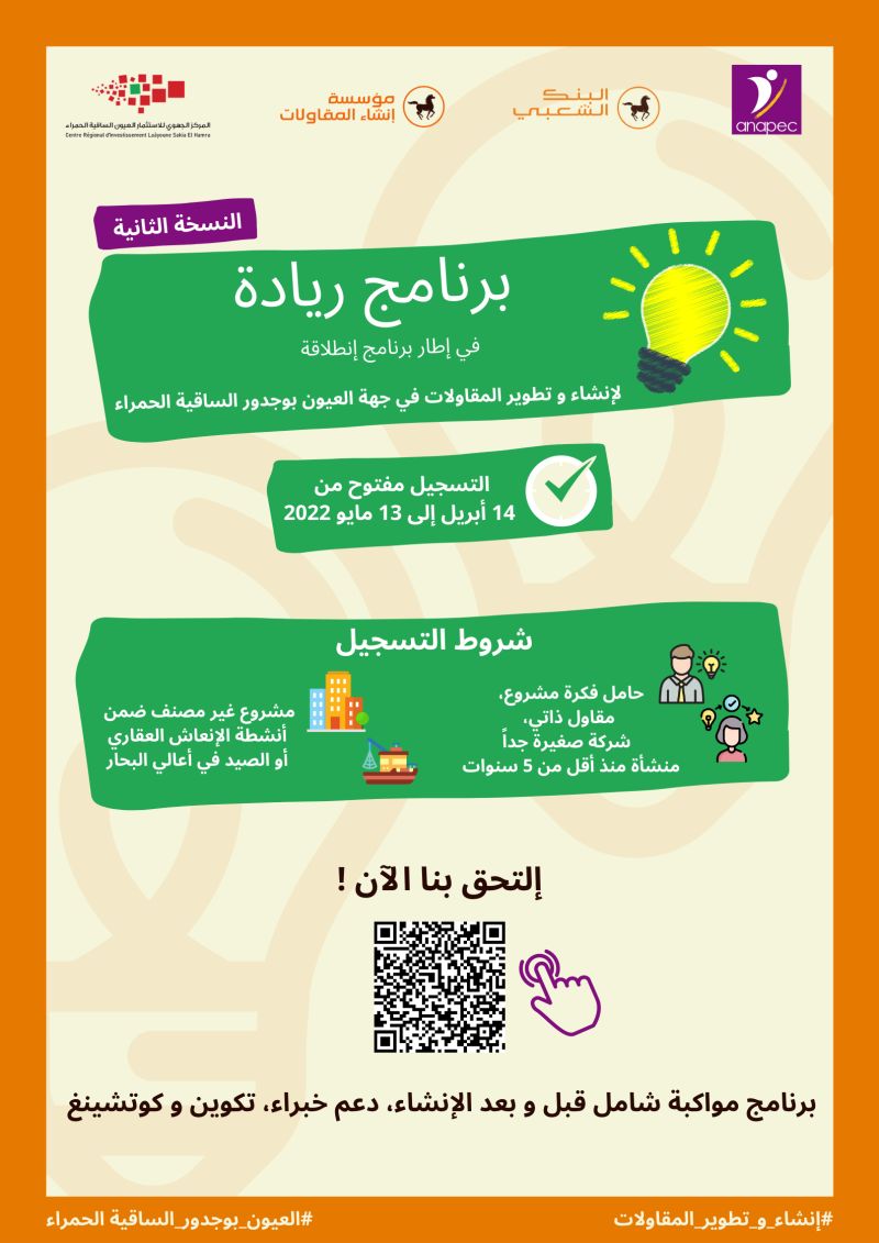 Suivant les Hautes Instructions Royales visant la promotion de l’entrepreneuriat et dans le cadre de la mise en œuvre de la convention signée entre la Fondation Création d’Entreprises, le Centre Régional d’Investissement de Laâyoune Sakia El Hamra, la Banque Populaire Régionale de Laayoune et l’ANAPEC, un appel à projets est lancé du 14 avril au 13 mai 2022 ciblant les porteurs de projets, auto-entrepreneurs et les TPE de la région.