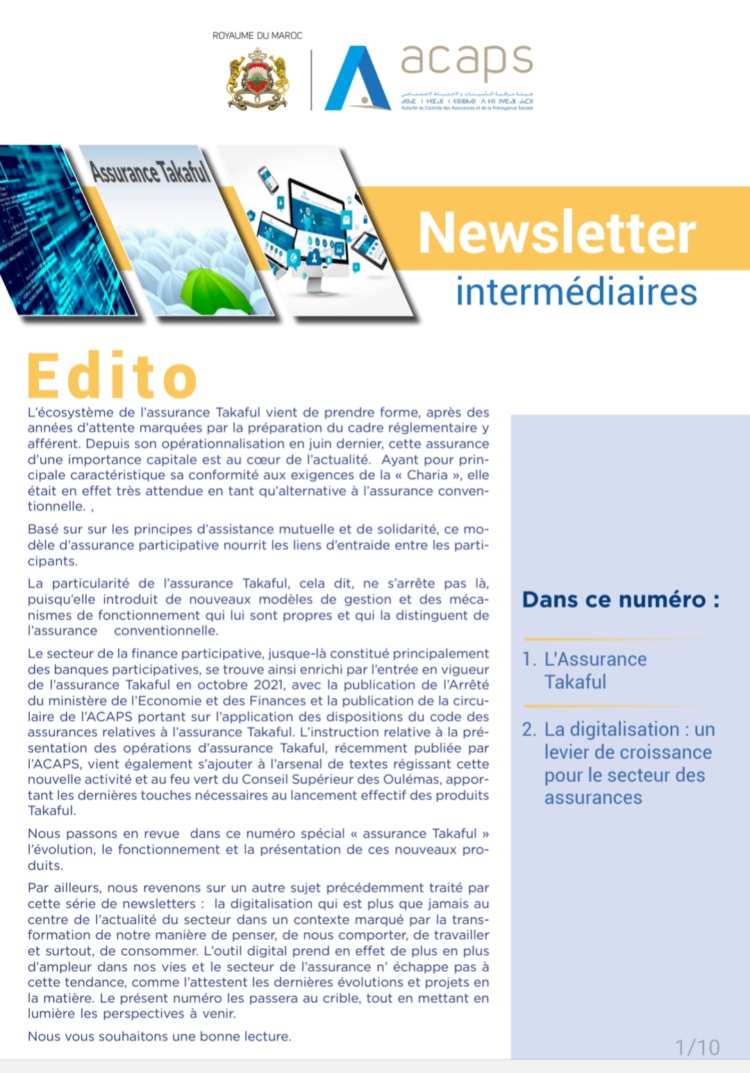 Dans l’édito de ce numéro, l’ACAPS souligne que l’écosystème de l’assurance Takaful vient de prendre forme, après des années d’attente marquées par la préparation du cadre réglementaire y afférent. Depuis son opérationnalisation en juin dernier, cette assurance d’une importance capitale est au cœur de l’actualité.