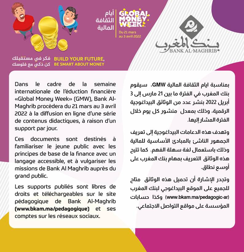 Piloté à l’international par l’OCDE (Organisation de Coopération et de Développement Économique), cet événement mobilise les acteurs des secteurs éducatifs et financiers dans le but de rapprocher les enfants et les jeunes du monde de la finance. L’année 2022 marque la 10ème édition de cet événement, le Maroc y prend part depuis sa première édition en 2012. Pour cette édition spéciale, le programme prévu connaît une mobilisation de toutes les parties prenantes marquant le caractère fédérateur et inclusif de cet événement. Diversité et inclusion qui se matérialisent par l’association de nouvelles parties prenantes, le développement d’actions et d’initiatives innovantes à l’attention de cibles diversifiées des enfants, juniors et jeunes ainsi que leur écosystème. GMW 2022 a pour thème à l’international, “Build your future, be smart about money” et au Maroc فكر في مستقبلك، كن ذكي مع فلوسك