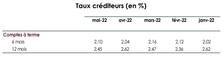Les taux de rémunération des dépôts à terme à 12 mois ont enregistré, à fin mai 2022, une baisse de 17 points de base pour s’établir à 2,45% alors que ceux à 6 mois ont augmenté de 6 points de base pour atteindre 2,10%. Pour les comptes d’épargne, leur taux minimum de rémunération a été fixé à 1,24% pour le deuxième semestre 2022, soit une hausse de 19 points de base.par rapport au semestre précédent.