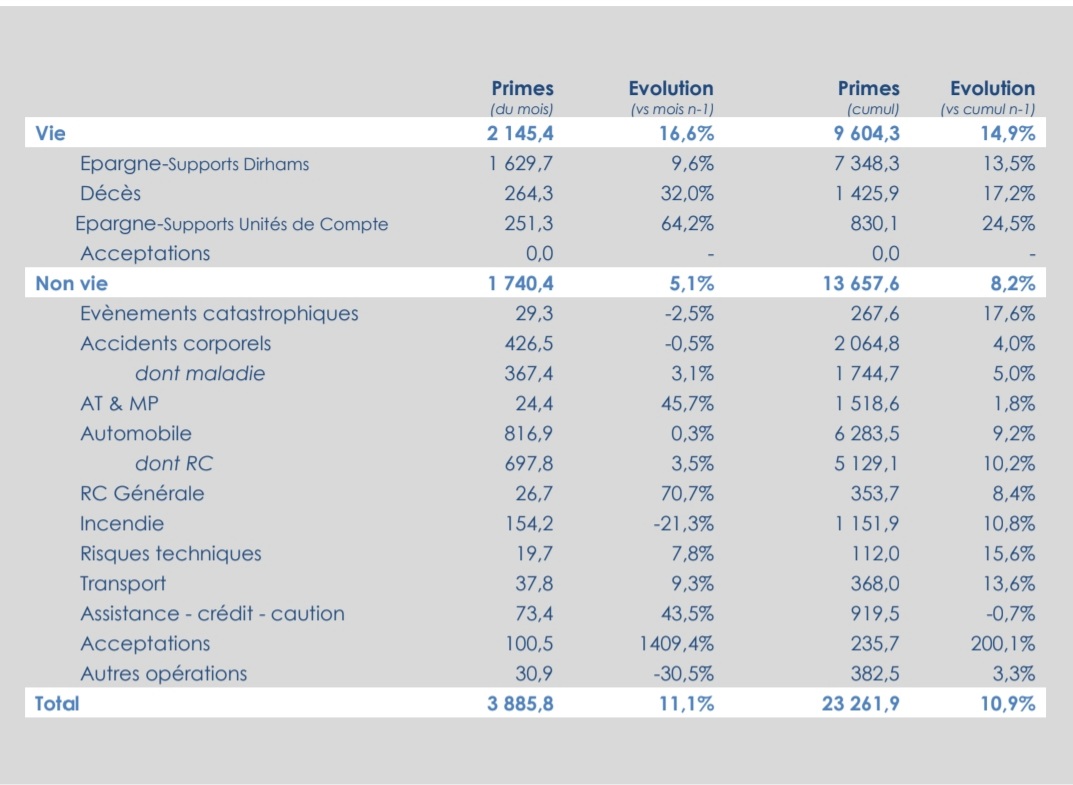 A noter que les primes globales du secteur des assurances (Vie et Non Vie) affichent une croissance de 10,9% à fin mai pour atteindre 23,2 milliards de DH. La branche Non-Vie a enregistré une hausse de 8,2% à 13,6 milliards de DH, avec une augmentation de 9,2% à 6,2 milliards des primes d’assurance automobile. De ce fait, l’épargne en dirhams a drainé à fin mai plus de primes que l’automobile.