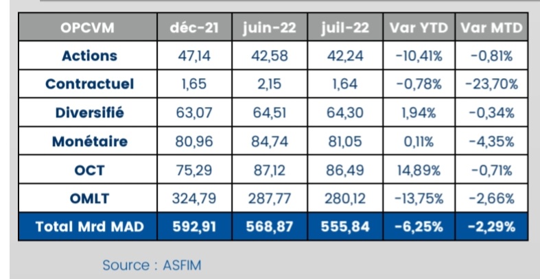 L’actif net sous gestion des Organismes de placement collectif en valeurs mobilières (OPCVM) à atteint 555,84 milliards de DH à fin juillet dernier. Soit une baisse de 6,25% par rapport à fin décembre 2021, selon l’Association des sociétés de gestion et fonds d’investissement marocains (ASFIM).