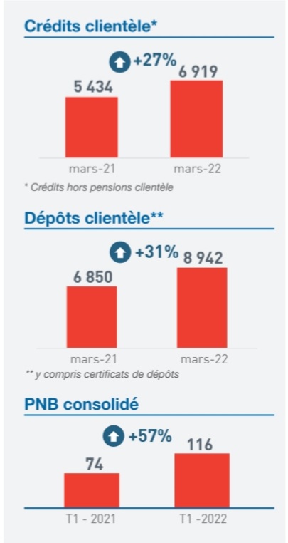 Après une année 2021 de forte progression, le 1er trimestre 2022 continue d’afficher de bonnes performances, avec une croissance significative des différents indicateurs financiers du groupe sur 12 mois, notamment en termes de production de crédits et de collecte de dépôts.