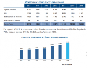 Cette évolution est due principalement à l’émergence des Établissements de Paiement (6.241 points d’accès) et à la progression de la capillarité du réseau bancaire (6.513 agences) sous l’effet de la hausse combinée des réseaux GAB cash-in & cash-out (541unités) et IOB (2.565 Intermédiaire en Opérations Bancaires). Par rapport à 2013, le nombre de points d’accès a connu une évolution considérable de près de 78%, passant ainsi de 8.913 à 15.860 points d’accès en 2019, selon le rapport annuel de Bank Al-Maghrib sur les infrastructures des marchés financiers, les moyens de paiement, leur surveillance et les initiatives d’inclusion financière.