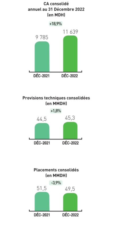 Les provisions techniques du groupe s’établissent à 45 Mrds de DH au 31 décembre 2022 en augmentation de 1,8% et les placements consolidés s’élèvent à 49,5 Mrds de DH à la même date en recul de -3,9% dans un marché boursier en baisse.
